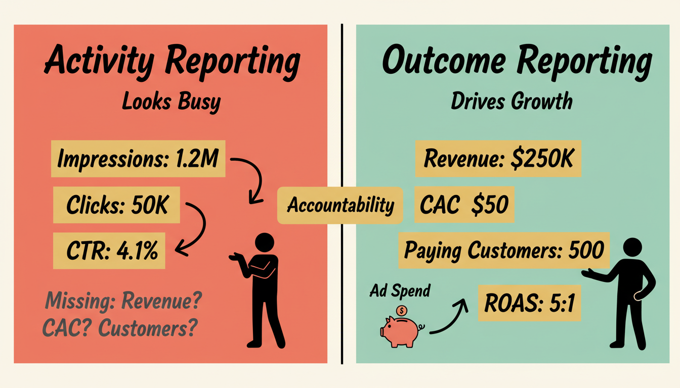 The bigger problem is accountability. Many agencies report on activity, not outcomes. They show you how many impressions ran, how many clicks came in, and what the CTR was. None of that tells you whether you acquired a customer at a profitable cost.